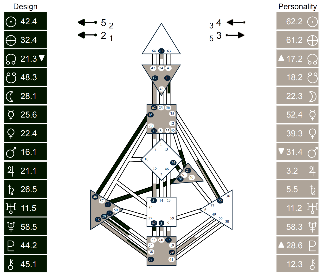 All of your definition is determined by the position of planets in the sky at those two key moments in time. You will notice that for each number listed in the left-hand column, the corresponding Gate on the chart will be highlighted with a dark line extending. For each number listed on the right-hand column, the corresponding Gate is highlighted with the line extending in grey. When you have both Gates of a Channel ‘defined’ (for reference in the chart above - which happens to be mine - this is the 44-26, the 17-62, the 48-16 or the 18-58) the two Energy Centers that are connected become ‘defined’.