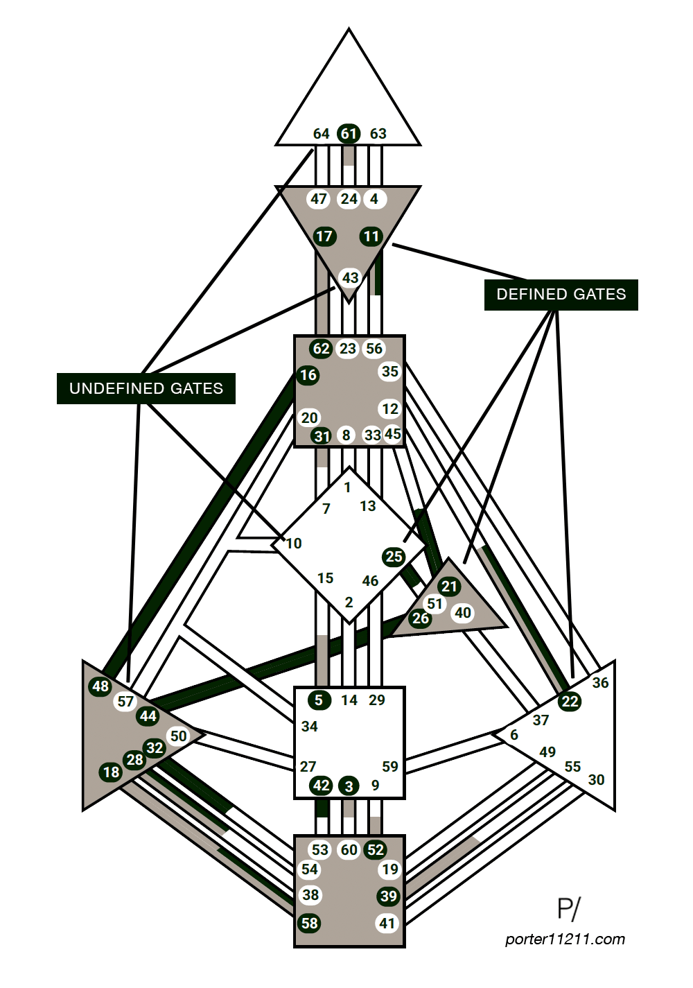 Each chart has a number of ‘defined’ Gates (the numbers on the chart that are highlighted with a dark circle). These defined gates are determined by the position of planets in the sky at two distinct moments - your time of birth and another point in time while you were still in utero.