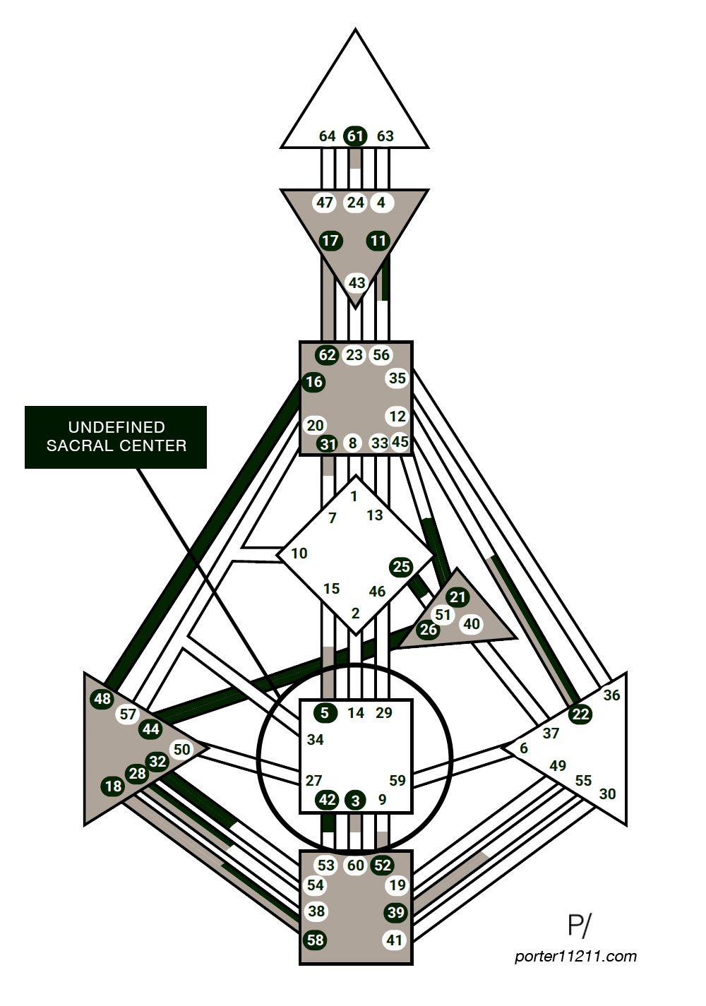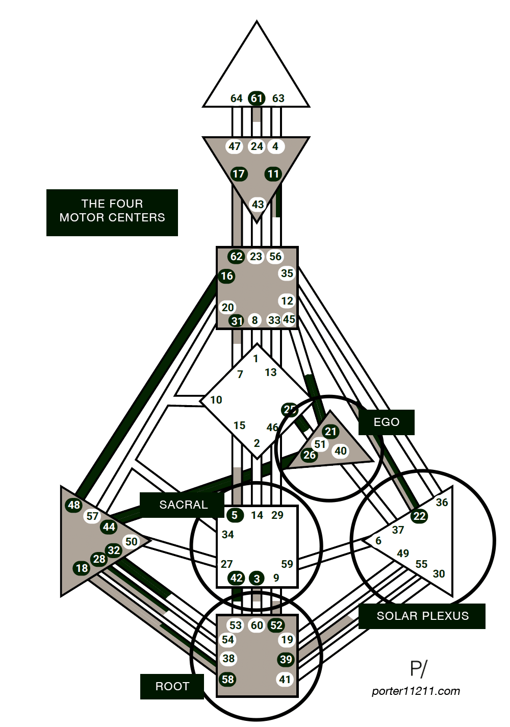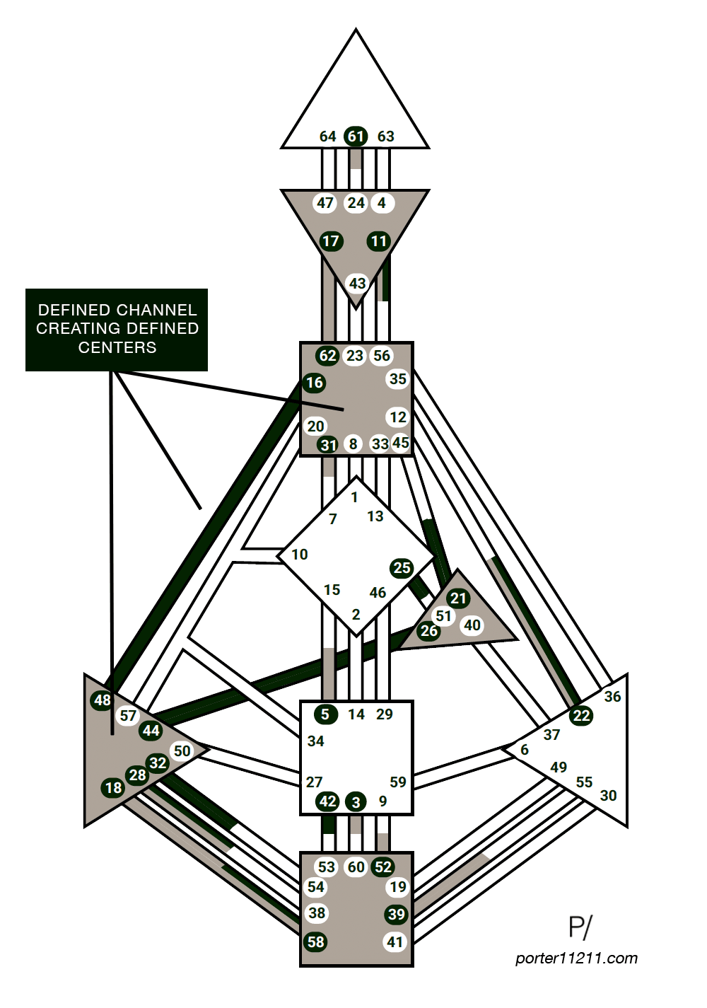 When there are two Gates defined that are opposite each other in the chart, they form a Channel (see example below). When a Channel is defined in any chart, the two Energy Centers on either side become defined. When looking at a chart, a defined Energy Center is any center that is ‘colored in’.