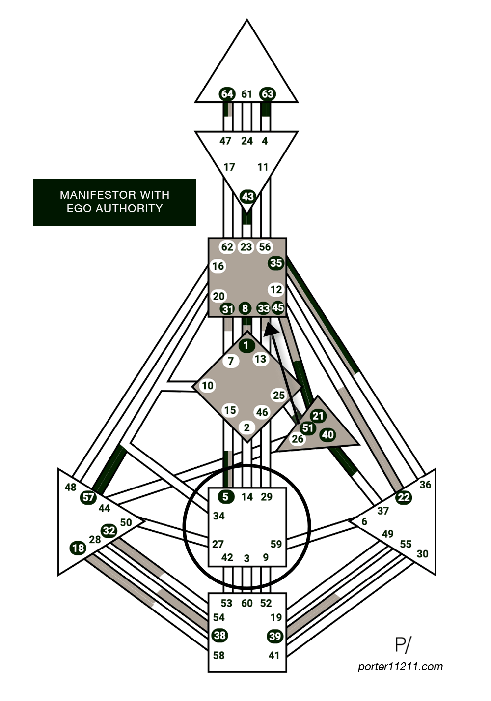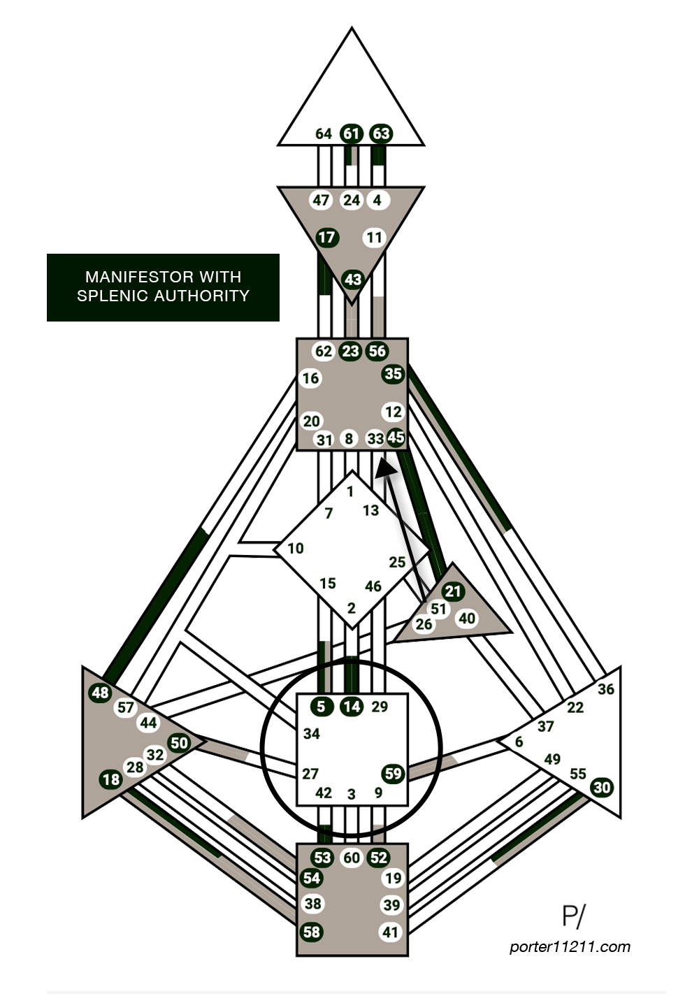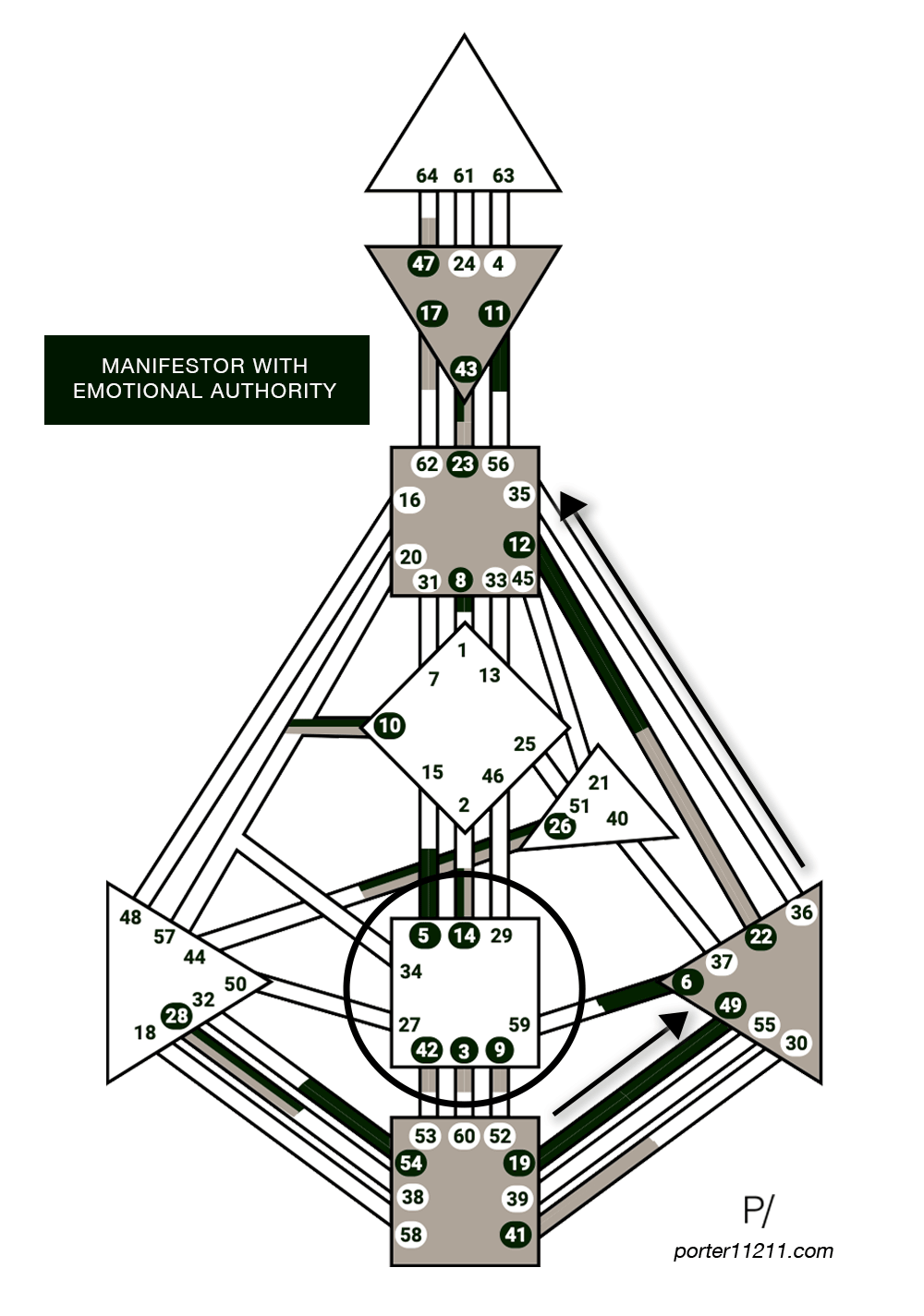 So all Manifestors will have a clear channel of energy that runs from a defined motor center up to their defined Throat center. This is the energetic that drives their powerful voice, their Strategy ‘to inform’ and their strong initiating abilities.